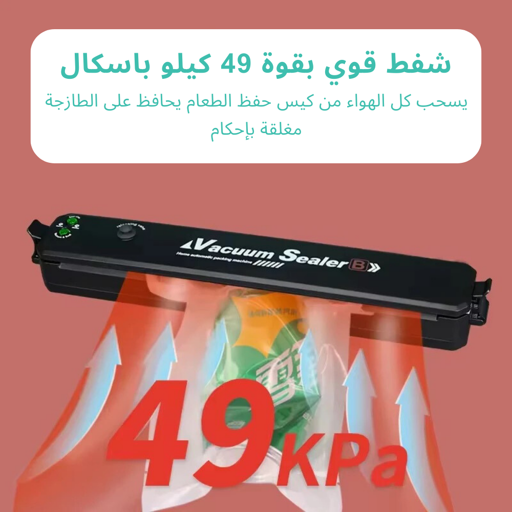 • قوة شفط قوية (49KPa): تقوم بسحب الهواء بالكامل من الأكياس لضمان إحكام الغلق وحفظ النكهة.