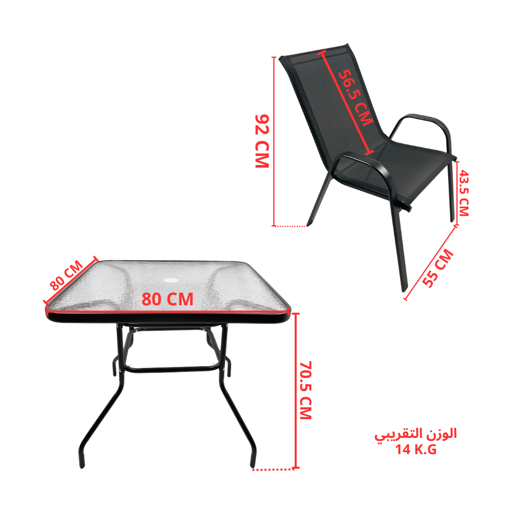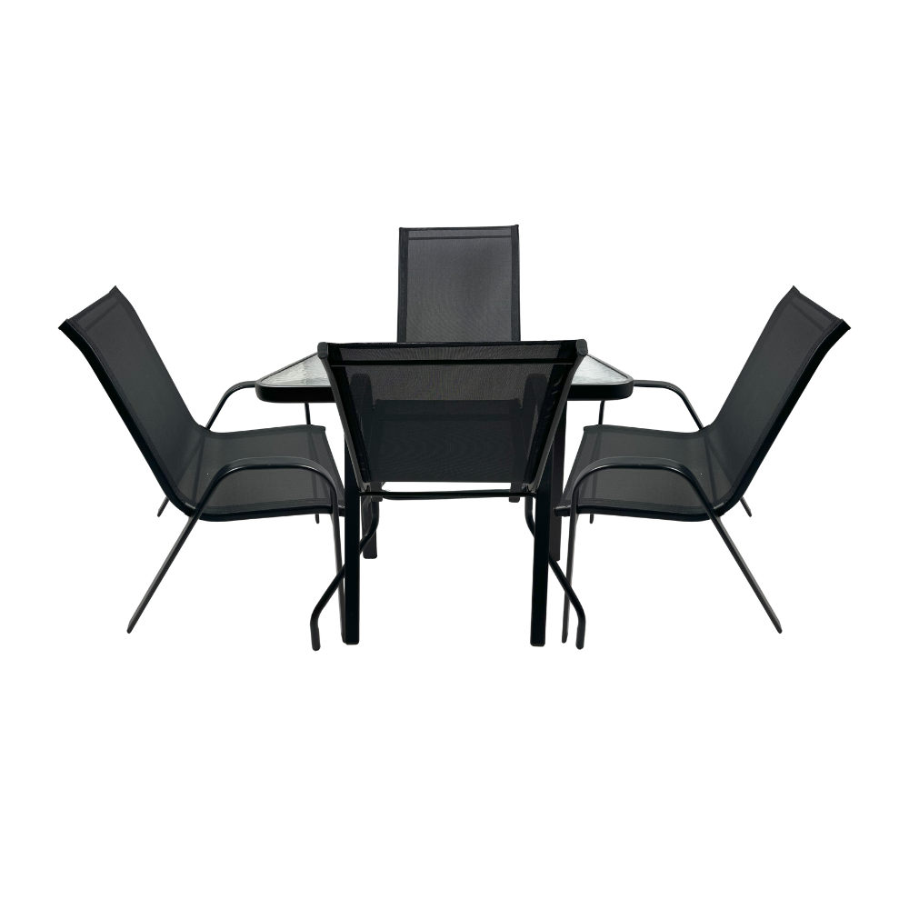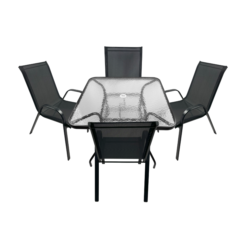 طقم طاولة وكراسي معدنية بتصميم شبكي عصري – 4 كراسي مع طاولة زجاجية مربعة